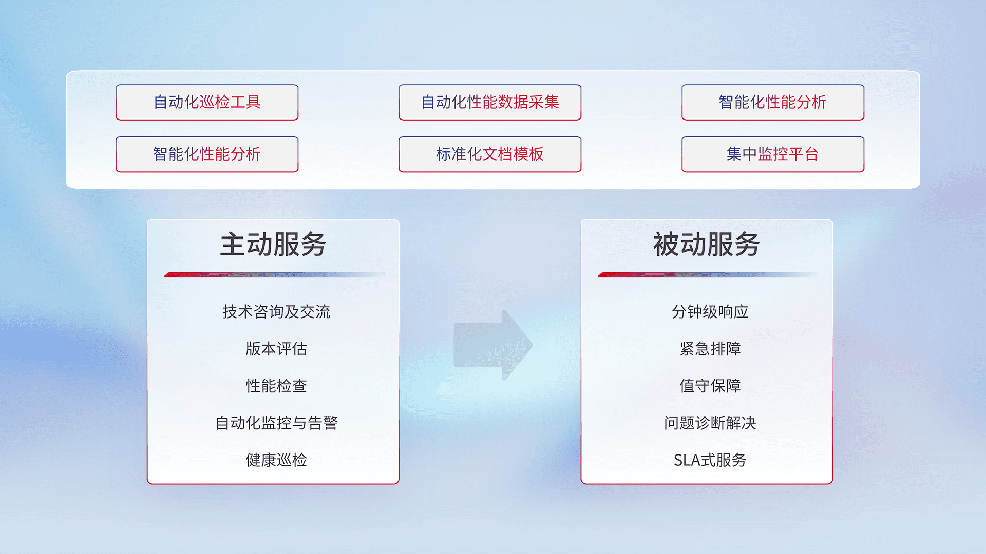 智能化工具和标准化文档,,保障服务质量,,,提供主动服务(包含技术咨询、、版本评估、、、、性能检查、、自动化监控与告警、、、、健康巡检)和被动服务包含(分钟级响应、、、紧急排障、、、、值守保障、、、、问题诊断解决、、、SLA服务)。。。